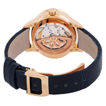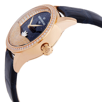 18kt rose gold case with a blue alligator leather strap. Fixed 18kt rose gold set with diamonds bezel. Blue aventurine dial. Dial Type: Analog. Girard Perregaux Calibre GP03300-0090 automatic movement with a 46-hour power reserve. Scratch resistant sapphire crystal. Pull / push crown. Transparent case back. Oval case shape, case size: 35.4 mm x 30.4 mm, case thickness: 11.6 mm. Folding buckle clasp. Water resistant at 30 meters / 100 feet. Functions: hour, minute. Cat's Eye Series. Luxury watch style. Watch label: Swiss Made. Girard Perregaux Cats Eye Arabian Jasmin Automatic Diamond Ladies Watch 80488D52A401-CK4A.