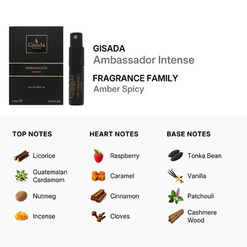 Belonging to the Amber Spicy fragrance family, Ambassador Intense opens with an exciting burst of top notes including Licorice, Guatemalan Cardamom, Nutmeg, and Mandarin Orange, balanced by fresh scents of Ozonic notes, Bergamot, and Lavender. A touch of Ginger, Incense, and Pink Pepper adds a dynamic edge to this magnetic introduction.