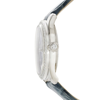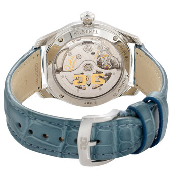 Silver-tone stainless steel case with a blue crocodile leather strap. Fixed silver-tone bezel with diamond set stainless steel. Blue dial with silver-tone hands and diamond hour markers. Dial Type: Analog. Date display at the 6 o'clock position. Glashutte Calibre 39-22 Automatic movement, containing 24 Jewels, bitting at 28800 vph, and has a power reserve of approximately 40 hours. Scratch resistant sapphire crystal. Pull / push crown. Transparent case back. Round case shape, case size: 36 mm, case thickness: 10.2 mm. Buckle clasp. Water resistant at 50 meters / 165 feet. Functions: date, hour, minute, second. Lady Serenade Series. Dress watch style. Watch label: Made in Germany. Glashutte Lady Serenade Automatic Diamond Blue Dial Ladies Watch 1-39-22-11-22-44.
