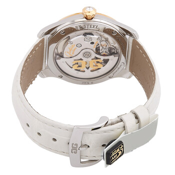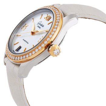 Silver-tone stainless steel case with a white alligator leather strap. Fixed 18kt rose gold set with diamonds bezel. Mother of pearl silver dial with rose gold-tone hands and index-Roman numeral hour markers. Dial Type: Analog. Date display at the 6 o'clock position. Glashutte Calibre 39-22 Automatic movement, containing 24 Jewels, bitting at 28800 vph, and has a power reserve of approximately 40 hours. Scratch resistant sapphire crystal. Transparent case back. Round case shape, case size: 36 mm, case thickness: 10.2 mm. Water resistant at 50 meters / 165 feet. Functions: date, hour, minute, second. Lady Serenade Series. Luxury watch style. Watch label: Made in Germany. Glashutte Original Lady Serenade Automatic Diamond Watch 1-39-22-09-16-44.