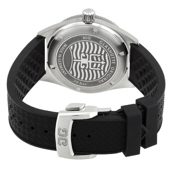 Silver-tone stainless steel case with a black rubber strap. Uni-directional rotating green ceramic bezel. Green dial with silver-tone hands and Arabic numeral, index hour markers. Minute markers around the outer rim. Dial Type: Analog. Luminescent hands and markers. Date display at the 3 o'clock position. Glashutte Original Calibre 39-11 Automatic movement, containing 25 Jewels, bitting at 28800 vph, and has a power reserve of approximately 40 hours. Scratch resistant sapphire crystal. Screw down crown. Solid case back. Round case shape, case size: 39.5 mm, case thickness: 12.15 mm. Deployant buckle clasp. Water resistant at 200 meters / 660 feet. Functions: date, hour, minute, second. Seaq Series. Luxury watch style. Watch label: Made In Germany. Glashutte Original SeaQ Automatic Green Dial Men's Watch 1-39-11-13-83-33.