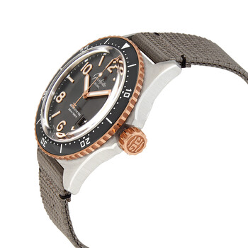 Stainless steel case with a grey fabric strap. Uni-directional rotating 18kt rose gold bezel with an inlaid black ceramic ring. Grey dial with luminous rose gold-tone hands and alternating Arabic numeral and index hour markers. Minute markers around the outer rim. Dial Type: Analog. Luminescent hands and markers. Date display between the 4 and 5 o'clock positions. Glashutte Original calibre 36-13 automatic movement, containing 41 Jewels, bitting at 28800 vph, and has a power reserve of approximately 100 hours. Scratch resistant sapphire crystal. Screw down crown. Transparent case back. Round case shape. Case size: 43.2 mm. Case thickness: 15.65 mm. Band width: 21 mm. Deployment clasp with a push button release. Water resistant at 300 meters / 1000 feet. Functions: date, hour, minute, second. Additional Info: original box, manual (complete accessories). Seaq Panorama Series. Luxury watch style. Watch label: Made In Germany. Glashutte Original SeaQ Panorama Automatic Grey Dial Men's Watch 1-36-13-04-91-34.