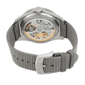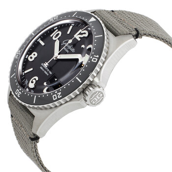 Silver-tone stainless steel case with a grey fabric strap. Uni-directional rotating black bezel. Black dial with silver-tone hands and Arabic numeral, index hour markers. Minute markers around the outer rim. Dial Type: Analog. Luminescent hands and markers. Date display between 4 and 5 o'clock position. Glashutte Original Calibre 36-13 Automatic movement, containing 41 Jewels, bitting at 28800 vph, and has a power reserve of approximately 100 hours. Scratch resistant sapphire crystal. Screw down crown. Transparent case back. Round case shape, case size: 43.2 mm, case thickness: 15.65 mm. Tang buckle clasp. Water resistant at 300 meters / 1000 feet. Functions: big date, hour, minute, small second. Seaq Panorama Date Series. Luxury watch style. Watch label: Made In Germany. Glashutte Original SeaQ Panorama Date Automatic Black Dial Men's Watch 1-36-13-01-80-08.