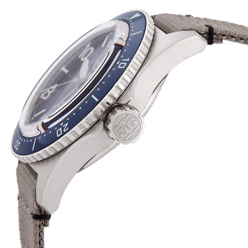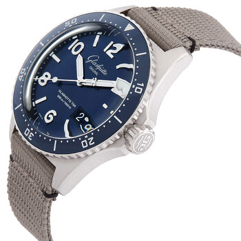 Silver-tone stainless steel case with a grey fabric strap. Uni-directional rotating blue bezel. Blue dial with silver-tone hands and Arabic numeral, index hour markers. Minute markers around the outer rim. Dial Type: Analog. Luminescent hands and markers. Date display between 4 and 5 o'clock position. Caliber 36-13 automatic movement with a 100-hour power reserve. Scratch resistant sapphire crystal. Screw down crown. Transparent case back. Round case shape, case size: 43.2 mm, case thickness: 15.65 mm. Deployant buckle clasp. Water resistant at 300 meters / 1000 feet. Functions: date, hour, minute, second. Seaq Panorama Date Series. Luxury watch style. Watch label: Made In Germany. Glashutte Original SeaQ Panorama Date Automatic Blue Dial Men's Watch 1-36-13-02-81-34.