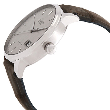 Silver-tone stainless steel case with a brown leather strap. Fixed silver-tone stainless steel bezel. Galvanized silver dial with silver-tone hands and index hour markers. Minute markers around the outer rim. Dial Type: Analog. Date display at the 4 o'clock position. Glashutte Calibre 36-03 Automatic movement, based upon 36-01, containing 41 Jewels, bitting at 28800 vph, and has a power reserve of approximately 100 hours. Scratch resistant sapphire crystal. Pull / push crown. Transparent see through case back. Round case shape, case size: 42 mm, case thickness: 12.2 mm. Water resistant at 50 meters / 165 feet. Functions: big date, hour, minute, second. Senator Excellence Panorama Series. Luxury watch style. Item Variations: 36-03-03-02-02. Glashutte Original Senator Excellence Panorama Automatic Men's Watch 1-36-03-03-02-02.