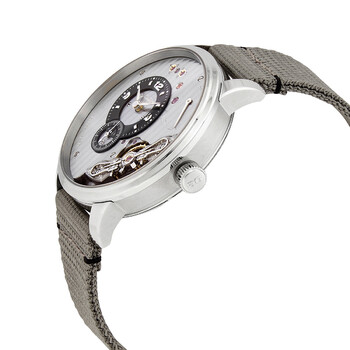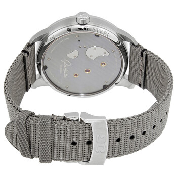 Stainless steel case with a grey nylon strap. Fixed stainless steel bezel. Grey (cut-out) dial with silver-tone hands and index hour markers. Arabic numerals appear at the 3, 9 and 12 o'clock positions. Minute markers around the outer rim. Dial Type: Analog. Luminescent hands. Small seconds sub-dial. Power reserve indicator. Glashutte calibre 66-06 hand wind movement, containing 31 Jewels, bitting at 28800 vph, and has a power reserve of approximately 41 hours. Scratch resistant sapphire crystal. Screw down crown. Solid case back. Round case shape. Case size: 42 mm. Case thickness: 12 mm. Band width: 21 mm. Deployment clasp. Water resistant at 50 meters / 165 feet. Functions: hour, minute, small second, power reserve indicator. Additional Info: original box, manual (complete accessories). Panoinverse Series. Luxury watch style. Watch label: Made in Germany. Glashutte PanoInverse Hand Wind Grey Dial Men's Watch 1-66-06-04-22-36.
