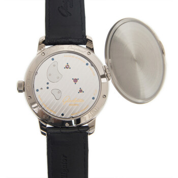 18kt white gold case with a black alligator leather strap. Fixed 18kt white gold bezel. Silver-tone dial with gold-tone hands and Arabic numeral and index hour markers. Dial Type: Analog. Luminescent hands. Two sub-dials displaying: small second and power reserve indicator. Hand wind movement. Scratch resistant sapphire crystal. Screw down crown. Transparent case back. Round case shape, case size: 42 mm, case thickness: 12 mm. Deployment clasp. Water resistant at 30 meters / 100 feet. Functions: hour, minute, second, power reserve indicator. Additional Info: original box, manual (complete accessories). Panoinverse Xl Series. Luxury watch style. Watch label: Made in Germany. Item Variations: 1-66-01-04-34-05. Glashutte Panoinverse Xl Hand Wind Silver Dial Unisex Watch 16601043405.