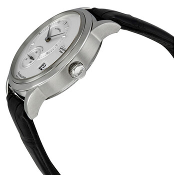 Silver-tone stainless steel case with a black leather strap. Fixed silver-tone stainless steel bezel. Silver dial with silver-tone hands and index hour markers. Dial Type: Analog. Date display near the 4 o'clock position. One subdial displaying: small second near the 7 o'clock position. Glashutte Calibre 90-01 Automatic movement, containing 41 Jewels, bitting at 28800 vph, and has a power reserve of approximately 42 hours. Scratch resistant sapphire crystal. Skeleton case back. Round case shape, case size: 39.3 mm, case thickness: 11.6 mm. Deployment clasp. Water resistant at 100 meters / 330 feet. Functions: big date, hour, minute, small second. Panomatic Date Series. Dress watch style. Watch label: Made in Germany. Item Variations: 9001020204. Glashutte PanoMaticDate Men's Watch 90-01-02-02-04.