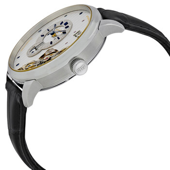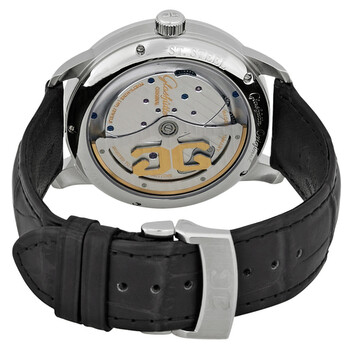 Silver-tone stainless steel case with a blue louisiana alligator leather strap. Fixed silver-tone stainless steel bezel. Galvanized dial with blued steel hands and index hour markers. Dial Type: Analog. Date display between 1 and 2 o'clock position. Small second subdials. Glashutte Calibre 91-02 automatic movement with a 42-hour power reserve. Scratch resistant sapphire crystal. Skeleton case back. Case size: 42 mm. Case thickness: 12.30 mm. Round case shape. Water resistant at 50 meters / 165 feet. Functions: big date, hour, minute, small second. Luxury watch style. Watch label: Made in Germany. Glashutte PanoMaticInverse Galvanized Dial Automatic Men's Watch 1-91-02-02-02-50.