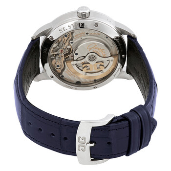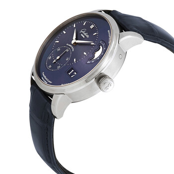 Silver-tone stainless steel case with a blue louisiana alligator leather strap. Fixed silver-tone stainless steel bezel. Blue dial with silver-tone hands and index hour markers. Dial Type: Analog. Luminescent hands. Date display at the 4 o'clock position. Two - 60 second and moon phase subdials. Glashutte Calibre 90-02 automatic movement with a 42-hour power reserve. Scratch resistant sapphire crystal. Round case shape, case size: 40 mm, case thickness: 12.7 mm. Buckle clasp. Water resistant at 50 meters / 165 feet. Functions: date, hour, minute, second, moonphase. Dress watch style. Watch label: Made In Germany. Glashutte PanoMaticLunar Automatic Blue Dial Men's Watch 1-90-02-46-32-01.