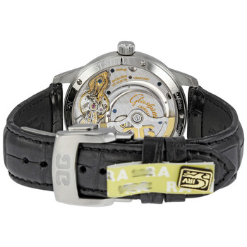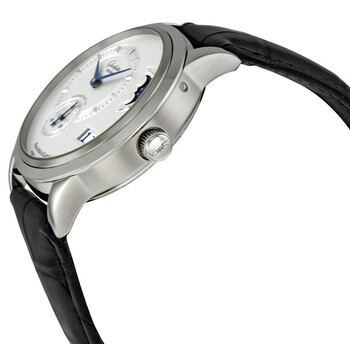 Stainless steel case with a black croco-embossed leather bracelet. Fixed stainless steel bezel. Silver dial with date display at 4 o'clock. Automatic movement. Scratch resistant sapphire crystal. Sapphire crystal caseback. Case diameter: 39.3 mm. Case thickness: 11.7 mm. Stainless steel fold-over clasp. Water resistant up to 100 meters (330 feet). Also known as 9001020204. Glashutte PanoMaticLunar Men's Watch 90-02-02-02-04