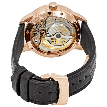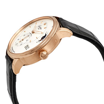 18 carat rose gold case with a black alligator leather strap. Fixed bezel. Silver dial with rose gold-tone hands and index hour markers. Dial Type: Analog. Luminescent hands. Date display at the 4 o'clock position. Two - 60 second and moonphase. Calibre 90-02 automatic movement. Scratch resistant sapphire crystal. Case size: 40 mm. Case thickness: 12.7 mm. Round case shape. Water resistant at 50 meters / 165 feet. Functions: date, hour, minute, second, moonphase. Luxury watch style. Watch label: Made In Germany. Glashutte PanoMaticLunar Silver Dial Men's Watch 90-02-45-35-05.