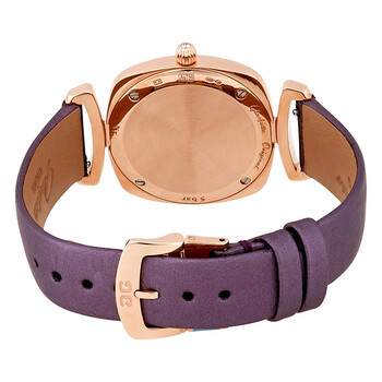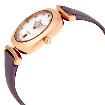 18kt rose gold case with a purple satin (alligator leather backed) strap. Diamond-set lugs. Fixed 18kt rose gold bezel. White mother of pearl dial with rose gold-tone hands and diamond hour markers. Dial Type: Analog. Date display at the 6 o'clock position. Glashutte calibre 03-01 quartz movement with a 48 months power reserve. Scratch resistant sapphire crystal. Pull / push crown. Solid case back. Cushion case shape. Case dimensions: 31 mm x 31 mm. Case thickness: 7.50 mm. Band width: 16 mm. Band length: 7 inches. Tang clasp. Water resistant at 50 meters / 165 feet. Functions: date, hour, minute. Additional Info: Lugsset with 42 diamonds (approx. ca. 0.14 ct, tw-vvs). Luxury watch style. Watch label: Made in Germany. Glashutte Pavonina 18kt Rose Gold White Mother of Pearl Diamond Dial Ladies Watch 1-03-01-08-05-34.