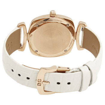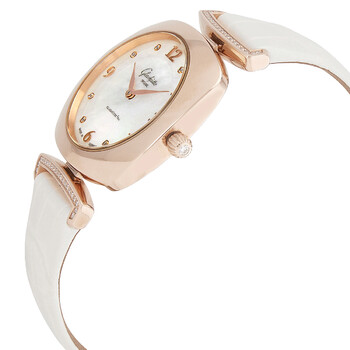 18kt rose gold case with a white (crocodile) leather strap. Fixed 18kt rose gold bezel. Diamond-set lugs. Mother of pearl dial with rose gold-tone hands and diamond hour markers. Arabic numerals appear at the 3, 6, 9 and 12 o'clock positions. Dial Type: Analog. Calibre 03-02 quartz movement. Scratch resistant sapphire crystal. Screw down crown. Solid case back. Cushion case shape. Case size: 31 mm. Case thickness: 7.5 mm. Fold over clasp. Water resistant at 500 meters / 1650 feet. Functions: hour, minute. Pavonina Series. Dive watch style. Watch label: Made in Germany. Glashutte Pavonina Diamond Mother of Pearl Dial Ladies Watch 103-02-04-05-30.
