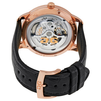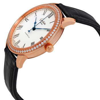 18kt rose gold case with a black alligator leather strap. Fixed 18kt rose gold bezel set with diamonds. Galvanised silver dial with blue hands and Roman numeral hour markers. Minute markers around the outer rim. Dial Type: Analog. Glashutte calibre 39-59 automatic movement with a 40-hour power reserve. Scratch resistant sapphire crystal. Pull / push crown. Transparent case back. Round case shape. Case size: 40 mm. Case thickness: 9.9 mm. Tang clasp. Water resistant at 50 meters / 165 feet. Functions: hour, minute, second. Luxury watch style. Watch label: Made in Germany. Glashutte Senator Automatic Diamond Men's Watch 39-59-01-15-04.