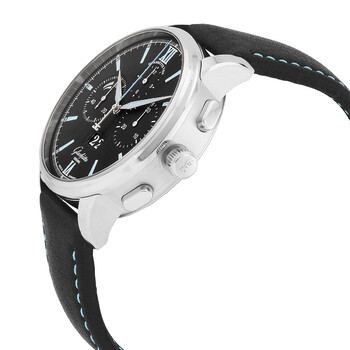 Stainless steel case with a black (calfskin) leather strap. Fixed stainless steel bezel. Black dial with luminous silver-tone hands and index hour markers. Roman numerals mark the 6 and 12 o'clock position. Minute markers around the outer rim. Dial Type: Analog. Luminescent hands and markers. Date display above the 6 o'clock position. Chronograph - three sub-dials displaying: 60 second, 30 minute and 12 hour. Glashutte calibre 37-01 automatic movement, containing 65 Jewels, bitting at 28800 vph, and has a power reserve of approximately 70 hours. Scratch resistant sapphire crystal. Screw down crown. Transparent case back. Round case shape. Case size: 42 mm. Case thickness: 14.6 mm. Band width: 20 mm. Deployment clasp. Water resistant at 50 meters / 165 feet. Functions: chronograph, column wheel, flyback, big date, hour, minute, small second, power reserve indicator. Senator Chronograph Panorama Date Series. Sport watch style. Watch label: Made in Germany. Glashutte Senator Chronograph Panorama Date Automatic Black Dial Men's Watch 1-37-01-03-02-55.