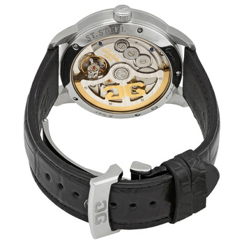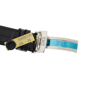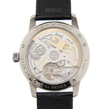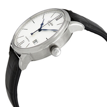 Stainless steel case with a black leather strap. Fixed stainless steel bezel. White dial with blue hands and index hour markers. Roman numerals mark the 6 and 12 o'clock positions. Minute markers around the outer rim. Dial Type: Analog. Date display at the 4 o'clock position. Glashutte calibre 36-03 automatic movement, based upon 36-01, containing 41 Jewels, bitting at 28800 vph, and has a power reserve of approximately 100 hours. Scratch resistant sapphire crystal. Transparent case back. Round case shape. Case size: 40 mm. Case thickness: 12.2 mm. Band width: 20 mm. Deployment clasp. Water resistant at 50 meters / 165 feet. Functions: date, hour, minute, second. Dress watch style. Glashutte SeNATOr Excellence Panorama Automatic Silver Dial Men's Watch 1-36-03-01-02-30.