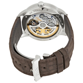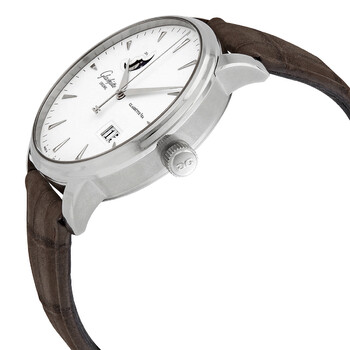 Silver-tone stainless steel case with a brown (alligator) leather strap. Fixed silver-tone stainless steel bezel. Silver dial with silver-tone alpha-style shape hands and index hour markers. Minute markers around the outer rim. Dial Type: Analog. Date display between 4 and 5 o'clock position. One subdial displaying: moonphase. Glashutte Calibre 36-01 Automatic movement, containing 27 Jewels, bitting at 28800 vph, and has a power reserve of approximately 100 hours. Scratch resistant sapphire crystal. Screw down crown. Transparent case back. Round case shape, case size: 42 mm, case thickness: 12.2 mm. Band width: 20 mm. Tang clasp. Water resistant at 50 meters / 165 feet. Functions: hour, minute, small second, moonphase. Senator Series. Luxury watch style. Watch label: Made in Germany. Glashutte Senator Excellence Panorama Date Moonphase Automatic Silver Dial Men's Watch 1-36-04-05-02-31.