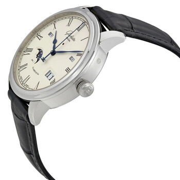 Silver-tone stainless steel case with a black alligator leather strap. Fixed silver-tone stainless steel bezel. White dial with blue spade-shaped hands and Roman numeral hour markers. Minute markers around the outer rim. Dial Type: Analog. Date display at the 4 o'clock position. day of the week display at the 10 o'clock position. month display at the 2 o'clock position. Moonphase display at the 8 o'clock position subdials. Glashutte Calibre 100-02 Automatic movement, based upon Glashutte 100-03, containing 59 Jewels, bitting at 28800 vph, and has a power reserve of approximately 55 hours. Scratch resistant sapphire crystal. Transparent case back. Round case shape, case size: 42 mm, case thickness: 13.6 mm. Deployment clasp. Water resistant at 50 meters / 165 feet. Functions: perpetual calendar, moon phase, leap year, big date, day, hour, minute, second. Senator Perpetual Calendar Series. Luxury watch style. Watch label: Made In Germany. Glashutte Senator Perpetual Calendar Watch.