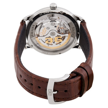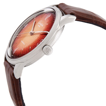 Stainless steel case with a brown leather strap. Fixed stainless steel bezel. Orange dial with luminous silver-tone hands and index hour markers. Arabic numerals mark the 3, 6, 9 and 12 o'clock positions. Minute markers around the outer rim. Dial Type: Analog. Luminescent hands and markers. Glashutte calibre 39-52 automatic movement, containing 25 Jewels, bitting at 28800 vph, and has a power reserve of approximately 40 hours. Scratch resistant sapphire crystal. Transparent case back. Round case shape. Case size: 39 mm. Case thickness: 9.4 mm. Band width: 20 mm. Tang clasp. Water resistant at 30 meters / 100 feet. Functions: hour, minute, second. Luxury watch style. Watch label: Made in Germany. Glashutte SeNATOr Sixties 20th Century Edition Automatic Orange Dial Men's Watch 1-39-52-13-02-04.