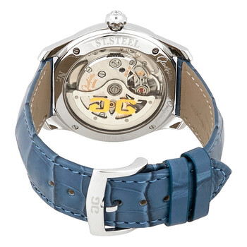 Stainless steel case with a blue alligator leather strap. Fixed bezel. Blue mother of pearl dial with silver-tone hands and Roman numeral hour markers. Dial Type: Analog. Date display at the 6 o'clock position. Glashutte Calibre 39-22 automatic movement with a 40-hour power reserve. Scratch resistant sapphire crystal. Case size: 36 mm. Case thickness: 10.2 mm. Round case shape. Tang clasp. Water resistant at 50 meters / 165 feet. Functions: date, hour, minute, second. Luxury watch style. Watch label: Made In Germany. Glashutte Serenade Blue Mother of Pearl Dial Ladies Watch 39-22-11-22-44.
