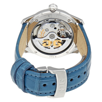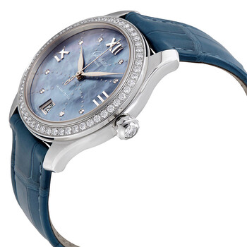 Silver-tone stainless steel case with a blue alligator leather strap. Fixed set with diamonds bezel. Blue mother of pearl dial with silver-tone hands and diamond with Roman numerals at 3, 6, 9, and 12 o'clock hour markers. Dial Type: Analog. Date display at the 6 o'clock position. Glashutte Calibre 39-22 automatic movement with a 40-hour power reserve. Scratch resistant sapphire crystal. Transparent case back. Round case shape, case size: 36 mm, case thickness: 10.2 mm. Deployment with push button release clasp. Water resistant at 50 meters / 165 feet. Functions: date, hour, minute, second. Luxury watch style. Watch label: Made In Germany. Glashutte Serenade Blue Mother Of Pearl Dial Ladies Watch 39-22-11-22-04.