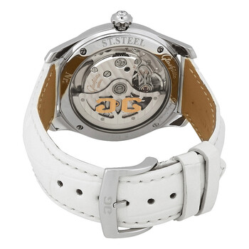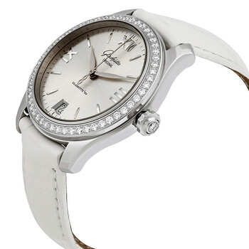 Stainless steel case with a beige (alligator) leather strap. Fixed stainless steel bezel set with diamonds. Silver dial with silver-tone hands and index hour markers. Roman numerals mark the 3, 9 and 12 o'clock positions. Minute markers around the outer rim. Dial Type: Analog. Date display at the 6 o'clock position. Glashutte calibre 39-22 automatic movement with a 40-hour power reserve. Scratch resistant sapphire crystal. Pull / push crown. Transparent case back. Round case shape. Case size: 36 mm. Case thickness: 10.2 mm. Tang clasp. Water resistant at 50 meters / 165 feet. Functions: date, hour, minute, second. Luxury watch style. Watch label: Made In Germany. Glashutte Serenade Silver Dial Ladies Watch 39-22-02-22-44.