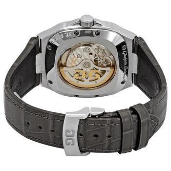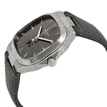 Stainless steel case with a grey (alligator) leather strap. Fixed stainless steel bezel. Grey dial with luminous silver-tone hands and index hour markers. Minute markers around the outer rim. Dial Type: Analog. Luminescent hands and markers. Date display above the 6 o'clock position. Glashutte calibre 39-47 automatic movement with a 40-hour power reserve. Scratch resistant sapphire crystal. Pull / push crown. Transparent case back. Cushion case shape. Case size: 40 mm. Case thickness: 11.5 mm. Deployment clasp. Water resistant at 100 meters / 330 feet. Functions: date, hour, minute, second. Luxury watch style. Watch label: Made In Germany. Glashutte Seventies Automatic Grey Dial Men's Watch 39-47-12-12-04.
