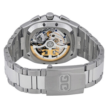 Silver-tone stainless steel case with a silver-tone stainless steel bracelet. Fixed silver-tone stainless steel bezel. Galvanized blue dial with silver-tone hands and index hour markers. Dial Type: Analog. Date display at the 6 o'clock position. Chronograph - two sub-dials displaying: 60 second and 30 minute. Glashutte Calibre 37-02 automatic movement with a 70-hour power reserve. Scratch resistant sapphire crystal. Case size: 40 mm x 40 mm. Case thickness: 13.50 mm. Cushion case shape. Water resistant at 100 meters / 330 feet. Functions: chronograph, date, hour, minute, second, power reserve. Luxury watch style. Watch label: Made in Germany. Glashutte Seventies Galvanized Blue Dial Men's Chronograph Watch 1-37-02-03-02-70.