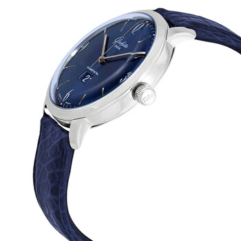 Stainless steel case with a blue alligator leather strap. Fixed bezel. Blue dial with silver-tone hands and index- Arabic numerals hour markers. Dial Type: Analog. Date display at the 6 o'clock position. Glashutte Calibre 39-47 automatic movement with a 40-hour power reserve. Scratch resistant sapphire crystal. Pull / push crown. Round case shape, case size: 42 mm, case thickness: 12.4 mm. Water resistant at 30 meters / 100 feet. Functions: date, hour, minute, second. Luxury watch style. Watch label: Made In Germany. Glashutte Sixties Blue Dial Automatic Men's Watch 39-47-06-02-04.