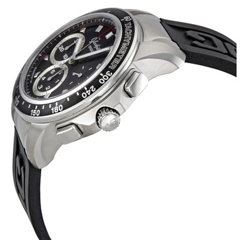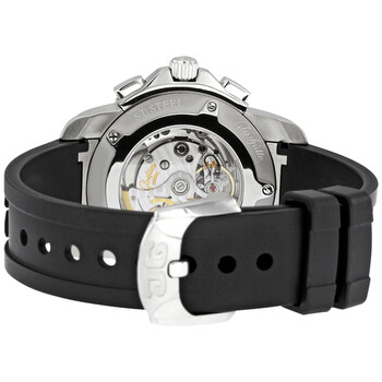 Stainless steel case with a black rubber strap. Fixed black ion-plated bezel with tachymeter. Black dial with luminous hands and index hour markers. Minute markers. Tachymeter scale appears around the outer rim. Dial Type: analog. Chronograph - three sub-dlals displaying: 6 hours, 30 minutes and 60 seconds. Automatic movement. Scratch resistant sapphire crystal. Skeleton case back. Case diameter: 42 mm. Case thickness: 14.5 mm. Tang clasp. Water resistant at 100 meters /330 feet. Functions: hours, minutes, seconds, chronograph. Luxury Sport watch style. Glashutte Sport Evolution Chronograph Black Dial Black Rubber Men's Watch 39-31-43-03-04.