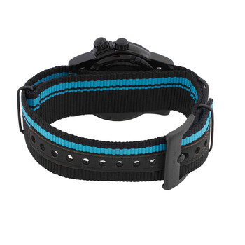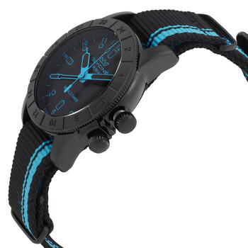 Black stainless steel case with a black and light blue nylon strap. Black stainless steel bezel. Black dial with blue hands and Arabic numeral hour markers. Minute markers around the outer rim. Dial Type: Analog. Luminescent hands and markers. Date display at the 3 o'clock position. Ronda Caliber 515.24H quartz movement. Scratch resistant sapphire crystal. Screw down crown. Solid case back. Round case shape, case size: 42 mm, case thickness: 14 mm. Band width: 22 mm, band length: 8.8 inches. Buckle clasp. Water resistant at 100 meters / 330 feet. Functions: date, GMT, second time zone, hour, minute, second. Airman Contemporary Worldtimer Series. Sport watch style. Watch label: Swiss Movt. Glycine Airman Contemporary Worldtimer GMT Quartz Black Dial Men's Watch GL1026.