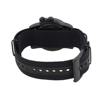 Black stainless steel case with a black nylon strap. Black stainless steel bezel. Black dial with red hands and Arabic numeral hour markers. Minute markers around the outer rim. Dial Type: Analog. Luminescent hands and markers. Date display at the 3 o'clock position. Ronda Caliber 515.24H quartz movement. Scratch resistant sapphire crystal. Screw down crown. Solid case back. Round case shape, case size: 42 mm, case thickness: 14 mm. Band width: 22 mm, band length: 8.8 inches. Buckle clasp. Water resistant at 100 meters / 330 feet. Functions: date, GMT, second time zone, hour, minute, second. Airman Contemporary Worldtimer Series. Sport watch style. Watch label: Swiss Movt. Glycine Airman Contemporary Worldtimer GMT Quartz Black Dial Men's Watch GL1027.