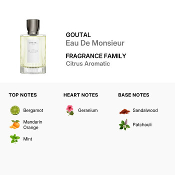 Part of the Citrus Aromatic fragrance family, Eau De Monsieur opens with a bright burst of bergamot, juicy mandarin orange, and a refreshing touch of mint. These crisp top notes awaken the senses with an energetic start. At its heart lies the elegant scent of geranium, adding a green floral balance that feels clean and confident. The fragrance settles into a warm, lasting base of sandalwood and patchouli, giving it a smooth and masculine finish that lingers throughout the day.