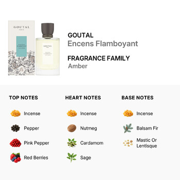 The fragrance opens with a vibrant burst of incense, pepper, pink pepper, and red berries, delivering an invigorating and spicy introduction. As the scent develops, heart notes of incense, nutmeg, cardamom, and sage add a rich and aromatic depth, wrapping you in warmth and refinement. Finally, the base notes of incense, balsam fir, and mastic or lentisque create a smoky, resinous finish that leaves a lasting impression.