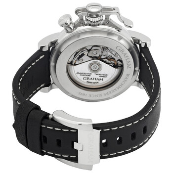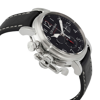 Silver-tone stainless steel case with a black leather strap. Silver-tone stainless steel bezel. Black dial with silver-tone hands and Arabic & index hour markers. Minute markers around the outer rim. Dial Type: Analog. Luminescent hands and markers. Date display at the 9 o'clock position. Chronograph - two sub-dials displaying: 60 second and 30 minute. Graham Calibre G1747 Automatic movement, based upon ETA 7750, containing 25 Jewels, bitting at 28800 vph, and has a power reserve of approximately 42 hours. Scratch resistant sapphire crystal. Pull / push crown. Transparent case back. Round case shape, case size: 47 mm. Tang clasp. Water resistant at 100 meters / 330 feet. Functions: chronograph, date, hour, minute, small second. Chornofigher Vintage Series. Sport watch style. Watch label: Swiss Made. Graham Chornofigher Vintage Chronograph Automatic Black Dial Unisex Watch 2CVDS.B29A.