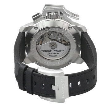 Silver-tone stainless steel case with a black leather strap. Fixed silver-tone stainless steel bezel. Blue dial with Arabic numeral hour markers. Minute markers around the outer rim. Dial Type: Analog. Luminescent hands and markers. Date display between 8 and 9 o'clock position. Chronograph - two sub-dials displaying: 60 second and 30 minute. Graham Calibre G1747 Automatic movement, based upon ETA 7750, containing 25 Jewels, bitting at 28800 vph, and has a power reserve of approximately 42 hours. Scratch resistant sapphire crystal. Transparent case back. Round case shape, case size: 47 mm. Tang clasp. Water resistant at 100 meters / 330 feet. Functions: chronograph, date, hour, minute, small second. Chronofighter Series. Sport watch style. Graham Chronofighter Chronograph Automatic Blue Dial Men's Watch 2CCAS.U01A.