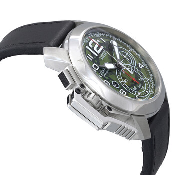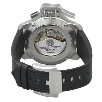 Silver-tone stainless steel case with a rubber strap. Fixed silver-tone stainless steel bezel. Green skeleton dial with Arabic numeral hour markers. Minute markers around the outer rim. Dial Type: Analog. Date display between 8 and 9 o'clock position. Chronograph - two sub-dials displaying: 60 second and 30 minute. Graham Calibre G1747 Automatic movement, based upon ETA 7750, containing 25 Jewels, bitting at 28800 vph, and has a power reserve of approximately 42 hours. Scratch resistant sapphire crystal. Transparent case back. Round case shape, case size: 47 mm, case thickness: 16.2 mm. Tang clasp. Water resistant at 100 meters / 330 feet. Functions: chronograph, date, hour, minute, small second. Chronofighter Series. Sport watch style. Graham Chronofighter Chronograph Green Skeleton Dial Automatic Men's Watch 2CCAS.G03A.