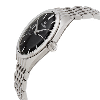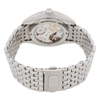Silver-tone stainless steel case and bracelet. Fixed silver-tone stainless steel bezel. Green dial with grey hands and index hour markers. Minute scale around the inner rim. Dial Type: Analog. One-small second subdials. Grand Seiko Calibre 9S63 automatic movement with a 72-hour power reserve. Scratch resistant sapphire crystal. Screw down crown. Transparent see through case back. Round case shape, case size: 39 mm, case thickness: 11.6 mm. Band width: 19 mm. Fold over clasp with a safety release. Water resistant at 30 meters / 100 feet. Functions: hour, minute, second,power reserve indicator. Elegance Series. Sport watch style. Watch label: Japan Movt. Item Variations: SBGK017G. Grand Seiko Elegance Automatic Grey Dial Ladies Watch SBGK017.