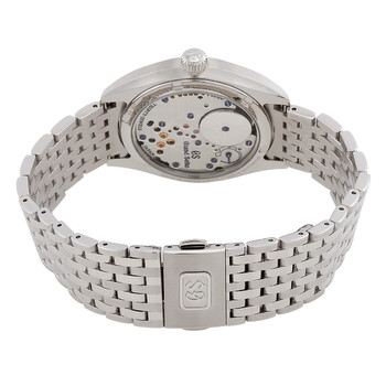 Silver-tone stainless steel case and bracelet. Fixed silver-tone stainless steel bezel. Omiwatari white dial with silver-tone hands and index hour markers. Minute markers around the outer rim. Dial Type: Analog. Grand Seiko Calibre 9R31 automatic movement with a 72-hour power reserve. Scratch resistant sapphire crystal. Transparent see through case back. Round case shape, case size: 38.5 mm, case thickness: 10.2 mm. Band width: 19 mm. Fold over clasp with a safety release. Functions: hour, minute, second. Additional Info: omiwatari spring drive. Elegance Series. Luxury watch style. Watch label: Japan Movt. Grand Seiko Elegance Automatic Ladies Watch SBGY013G.