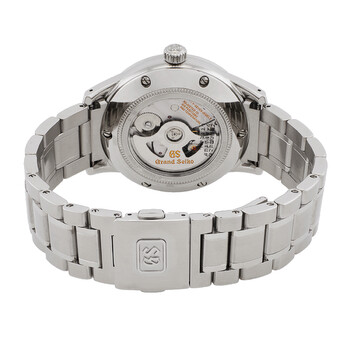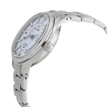 Silver-tone stainless steel case and bracelet. Fixed silver-tone stainless steel bezel. Blue dial with silver-tone hands and Arabic & index hour markers. Minute markers around the outer rim. Dial Type: Analog. Date display at the 3 o'clock position. Grand Seiko Caliber 9S86 automatic movement with a 55-hour power reserve. Scratch resistant sapphire crystal. Transparent case back. Round case shape, case size: 39.5 mm, case thickness: 14.1 mm. Band width: 19 mm. Deployment with push button release clasp. Functions: GMT, date, hour, minute, second. Elegance Series. Casual watch style. Watch label: Made in Japan. Grand Seiko Elegance Automatic Blue Dial Men's Watch SBGJ249G.