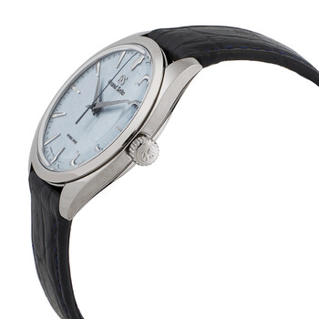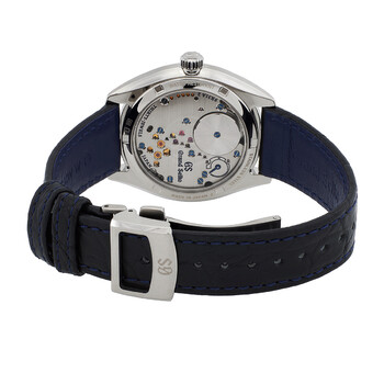 Silver-tone stainless steel case with a blue crocodile leather strap. Fixed silver-tone stainless steel bezel. Blue dial with silver-tone hands and index hour markers. Minute markers around the outer rim. Dial Type: Analog. Grand Seiko Caliber 9R31 hand wind movement with a 72-hour power reserve. Scratch resistant sapphire crystal. Pull / push crown. Transparent case back. Round case shape, case size: 38.5 mm, case thickness: 10.2 mm. Band width: 19 mm. Fold over with double push button release clasp. Functions: hour, minute, second. Elegance Series. Dress watch style. Watch label: Japan Movt. Grand Seiko Elegance Hand Wind Blue Dial Men's Watch SBGY007G.