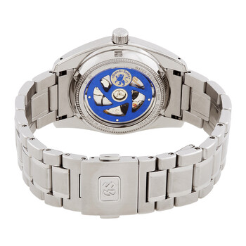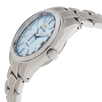Silver-tone stainless steel case and bracelet. Fixed silver-tone stainless steel bezel. Aqua dial with silver-tone hands and index hour markers. Minute scale around the inner rim. Dial Type: Analog. Date display at the 3 o'clock position. Grand Seiko Calibre 9S65 automatic movement with a 72-hour power reserve. Scratch resistant sapphire crystal. Screw down crown. Transparent see through case back. Round case shape, case size: 37 mm, case thickness: 13.3 mm. Band width: 19 mm. Three-fold with push button release clasp. Water resistant at 100 meters / 330 feet. Functions: date, hour, minute, second. Heritage Series. Sport watch style. Watch label: Japan Movt. Item Variations: SBGR325G. Grand Seiko Heritage Automatic Ladies Watch SBGR325.