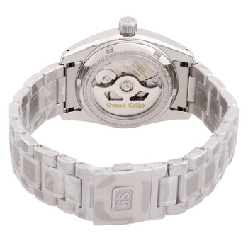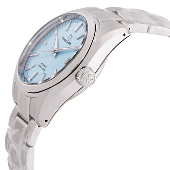 Silver-tone stainless steel case and bracelet. Fixed silver-tone stainless steel bezel. Icy blue dial with silver-tone hands and index hour markers. Minute markers around the outer rim. Dial Type: Analog. Date display at the 3 o'clock position. Grand Seiko Caliber 9S85 Automatic movement, containing 37 Jewels, bitting at 36000 vph, and has a power reserve of approximately 55 hours. Scratch resistant sapphire crystal. Solid case back. Round case shape, case size: 37 mm, case thickness: 13.3 mm. Band width: 19 mm. Water resistant at 100 meters / 330 feet. Functions: date, hour, minute, second. Heritage Collection Series. Watch label: Japan Movt. Grand Seiko Heritage Collection Icy Blue Watch SBGH347G.