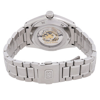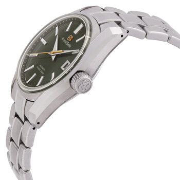 Silver-tone stainless steel case and bracelet. Fixed silver-tone stainless steel bezel. Green dial with silver-tone hands and index hour markers. Minute markers around the outer rim. Dial Type: Analog. Date display at the 3 o'clock position. Grand Seiko Caliber 9S85 Automatic movement, containing 37 Jewels, bitting at 36000 vph, and has a power reserve of approximately 55 hours. Scratch resistant sapphire crystal. Screw down crown. Transparent see through case back. Round case shape, case size: 40 mm, case thickness: 12.9 mm. Band width: 21 mm. Fold over clasp with a safety release. Water resistant at 100 meters / 330 feet. Functions: date, hour, minute, second. Heritage Series. Sport watch style. Watch label: Japan Movt. Grand Seiko Heritage Rikka Automatic Green Dial Men's Watch SBGH351G.