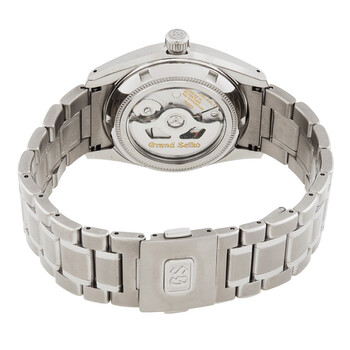Silver-tone high-intensity titanium case and bracelet. Fixed silver-tone bezel. Light green dial with silver-tone hands and index hour markers. Minute scale around the inner rim. Dial Type: Analog. Date display at the 3 o'clock position. Grand Seiko Calibre 9S85 automatic movement with a 55-hour power reserve. Scratch resistant sapphire crystal. Screw down crown. Transparent see through case back. Round case shape, case size: 38 mm, case thickness: 12.9 mm. Band width: 20 mm. Three-fold with push button release clasp. Water resistant at 100 meters / 330 feet. Functions: date, hour, minute, second. Heritage Series. Sport watch style. Watch label: Japan Movt. Grand Seiko Heritage Automatic Men's Watch SBGH343G.