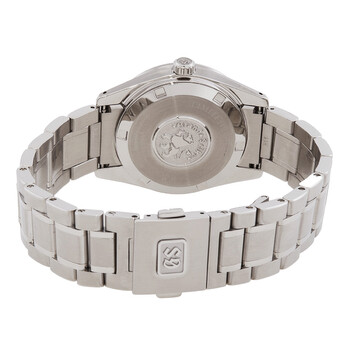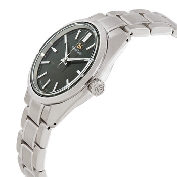 Silver-tone stainless steel case and bracelet. Fixed silver-tone stainless steel bezel. Olive dial with silver-tone hands and index hour markers. Minute scale around the inner rim. Dial Type: Analog. Grand Seiko Calibre 9S64 automatic movement with a 72-hour power reserve. Scratch resistant sapphire crystal. Solid case back. Round case shape, case size: 36.5 mm, case thickness: 11.6 mm. Band width: 18 mm. Three-fold with push button release clasp. Water resistant at 100 meters / 330 feet. Functions: hour, minute, second. Sport watch style. Watch label: Japan Movt. Item Variations: SBGW303G. Grand Seiko Automatic Unisex Watch SBGW303.