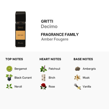 Decimo opens with a fresh and invigorating burst of bergamot, black currant, and neroli, creating a vibrant first impression. As the fragrance unfolds, the heart reveals a rich and earthy blend of patchouli, birch, and rose, adding depth and warmth. Finally, the base notes of ambergris, musk, and vanilla wrap the scent in an alluring, long-lasting finish that exudes confidence and sophistication.