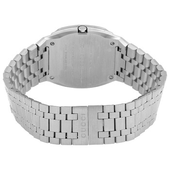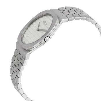 Stainless steel case with a stainless steel bracelet. Fixed stainless steel bezel. Silver dial with silver-tone hands. No markers. Dial Type: Analog. Quartz movement. Scratch resistant sapphire crystal. Solid case back. Round case shape. Case size: 30 mm. Fold over clasp with a safety release. Water resistant at 30 meters / 100 feet. Functions: hour, minute. 25h Series. Casual watch style. Watch label: Swiss Made. Gucci 25H Quartz Silver Dial Ladies Watch YA163501.