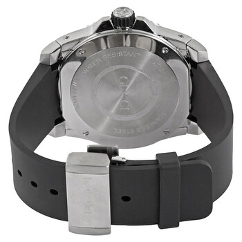 Stainless steel case with a black rubber strap. Uni-directional rotating stainless steel bezel with a black ceramic ring. Black (kingsnake) dial with luminous silver-tone hands and dot hour markers. Minute markers around the outer rim. Dial Type: Analog. Luminescent hands and markers. Date display at the 6 o'clock position. Quartz movement. Scratch resistant sapphire crystal. Screw down crown. Solid case back. Round case shape. Case size: 45 mm. Case thickness: 12 mm. Band width: 22 mm. Tang clasp. Water resistant at 200 meters / 660 feet. Functions: date, hour, minute, second. Dive watch style. Watch label: Swiss Made. Gucci Dive Dragon Quartz Black Dial Men's Watch YA136217.